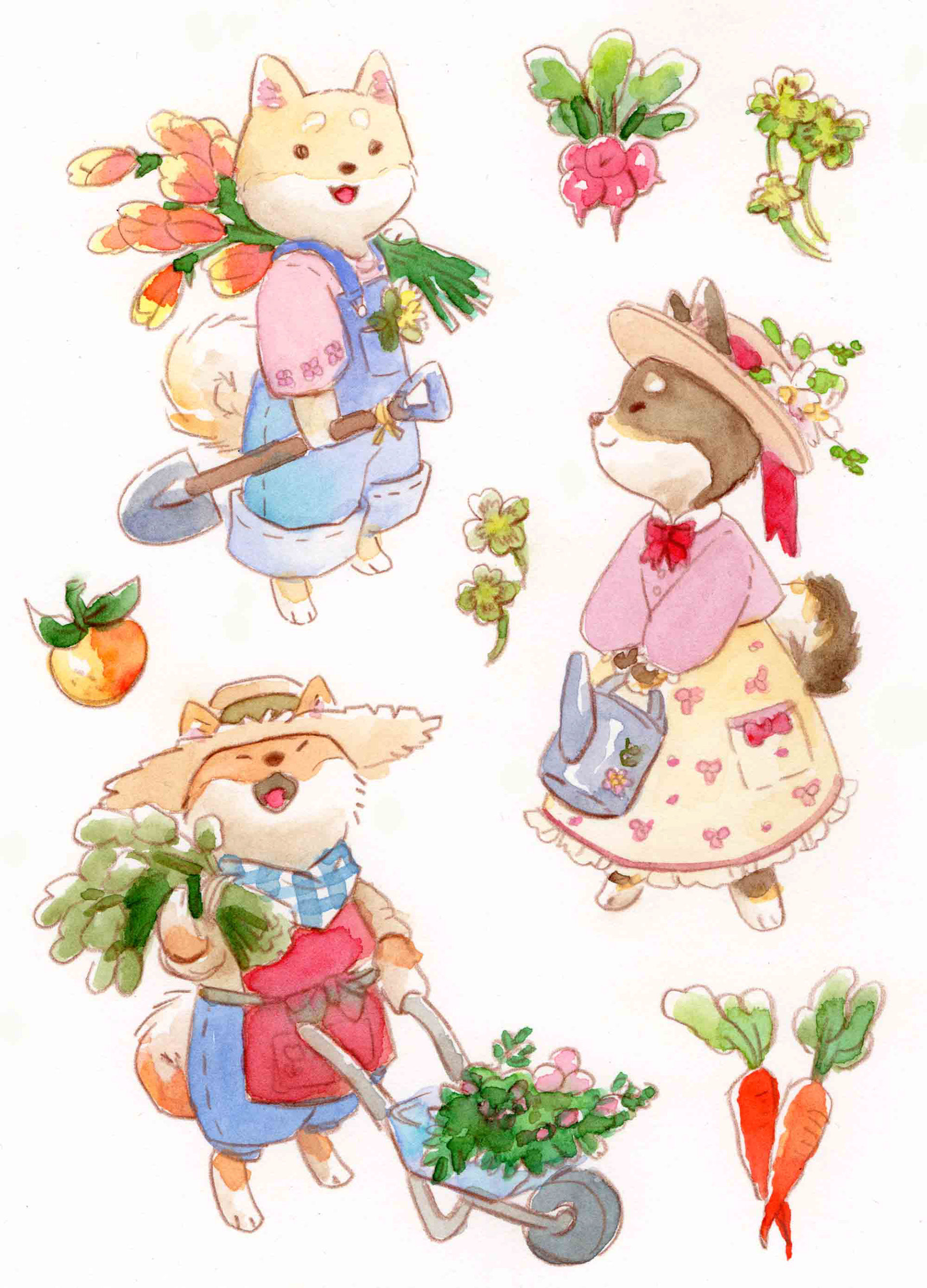 Shiba inu farmer dogs, watercolors for a sticker sheet, 2021