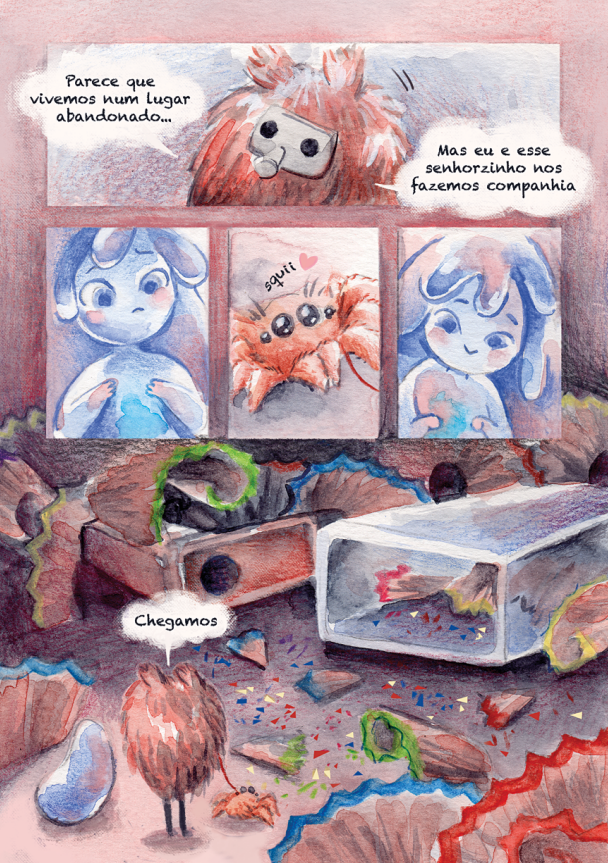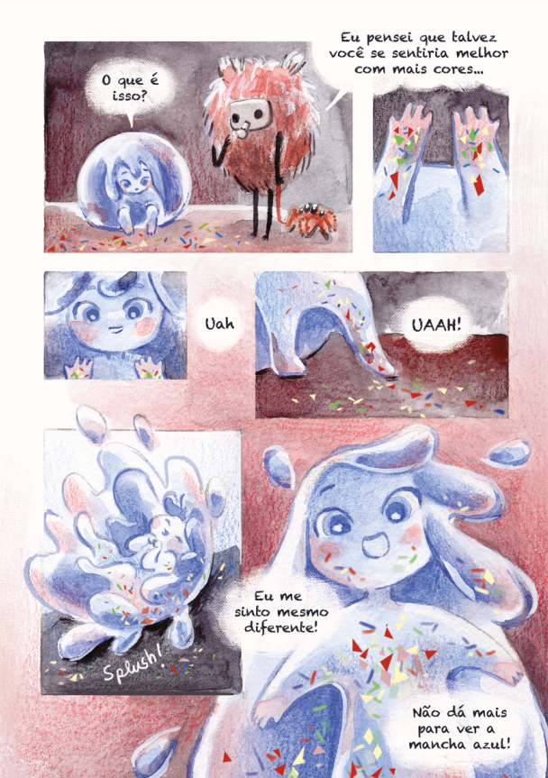 Lacrimosa tells a story about a tear drop that turns into life. She believes her mission is to make the crying person happy again. Made with watercolors, colored pencils and photoshop.
