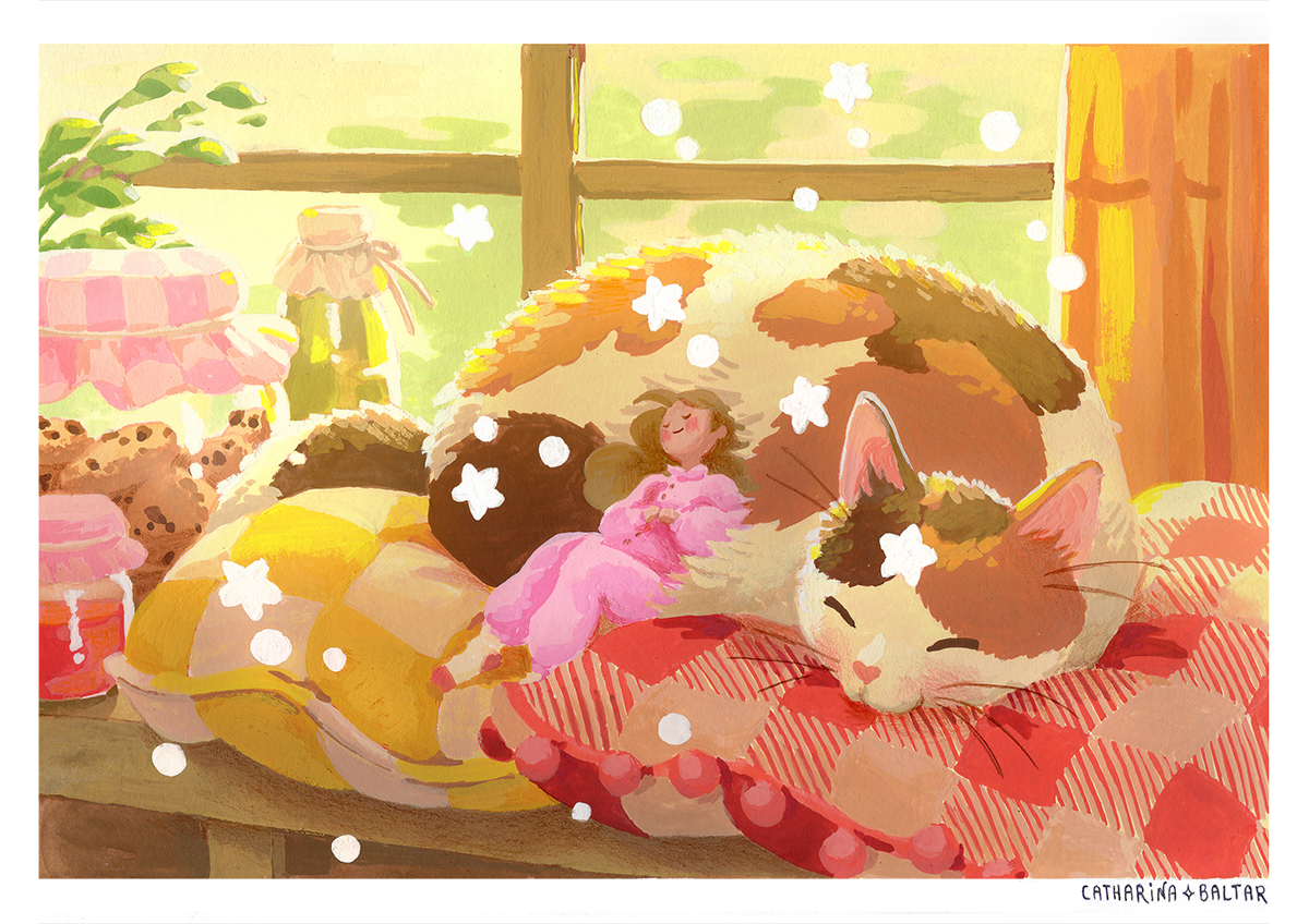 A relaxing moment with your fuzzy cat, gouache, 2021